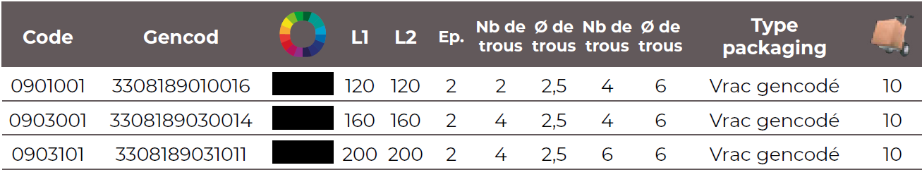 | Déclinaisons | L1 (mm) | L2 (mm) | Référence | EAN |