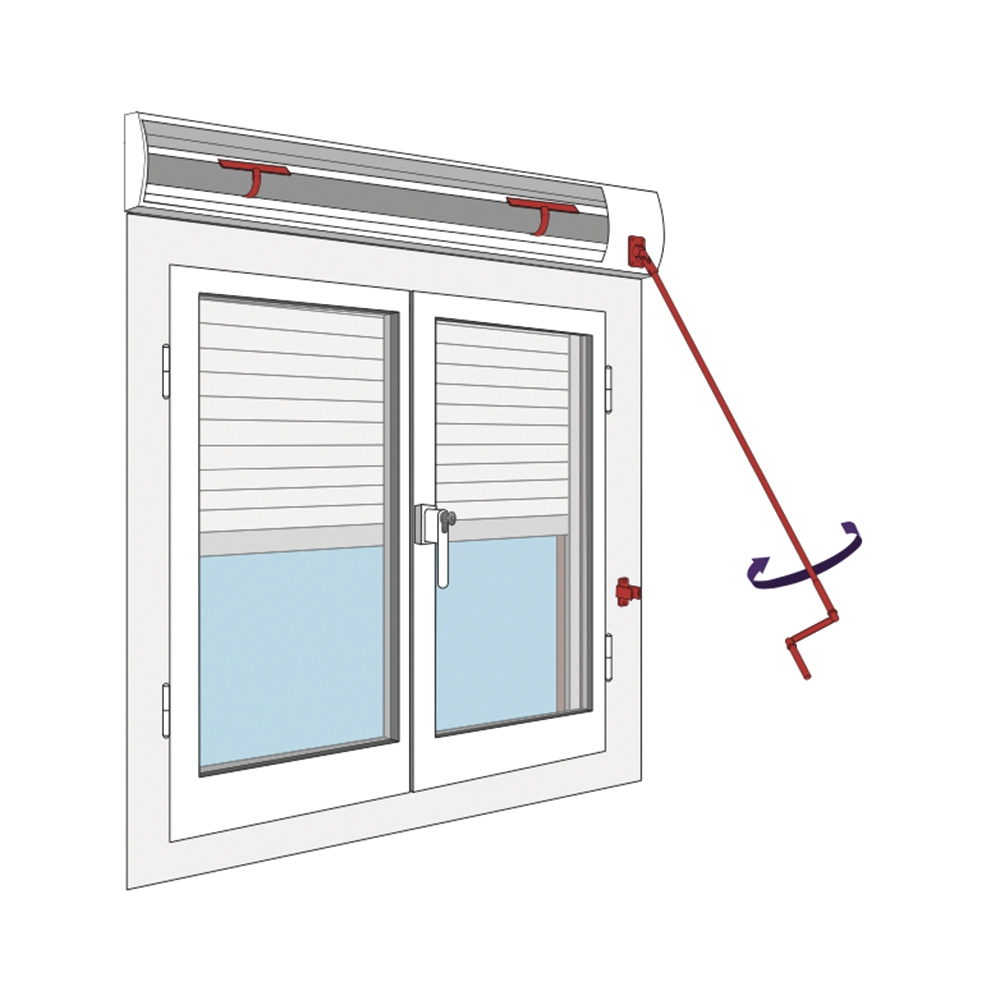 Cette manœuvre de volet roulant est l'une des plus répandues. Il suffit de fermer les volets grâce à une manivelle dotée d'une poignée qu'il faut tourner. Il y a plusieurs petits accessoires autour de la manivelle qui permettent de monter ou descendre les volets tels que la tringle qui est équipée d'une poignée et est fixée à une genouillère qui est elle-même fixée à la sortie de caisson.