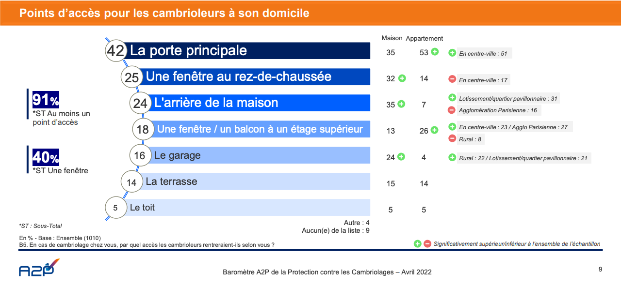 A2P a initié en 2022 un baromètre sur la protection des habitations contre les cambriolages. Une étude a été faite sur 1010 personnes âgées de plus de 18 ans qui ont dû répondre à un sondage en ligne de 25 questions en février 2022. Il en est sorti que 84% d'entre eux étaient préoccupés par le risque de cambriolage. Et seulement 2 sondés sur 10 estiment leur équipement efficace contre les risques d'effractions.