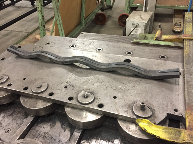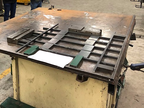 Avant la soudure, sur cette table de soudure se trouvent les barreaux et les traverses séparés par des cales. Les cales sont utilisées pour garder les bons entraxes et respecter les côtes de la fiche de production.