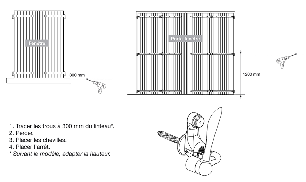 Les arrêts de volet doivent être positionnés à 300 mm du linteau dans le cas d'une fenêtre et à 1200 mm de haut sur une porte-fenêtre.